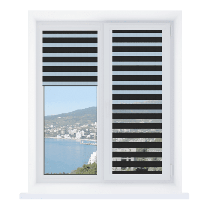 - Регулировка освещения. Возможность гибко управлять световым потоком, чередуя прозрачные и плотные полосы ткани, позволяет добиться как рассеянного света, так и полного затемнения, а также полностью открыть световой проем окна.